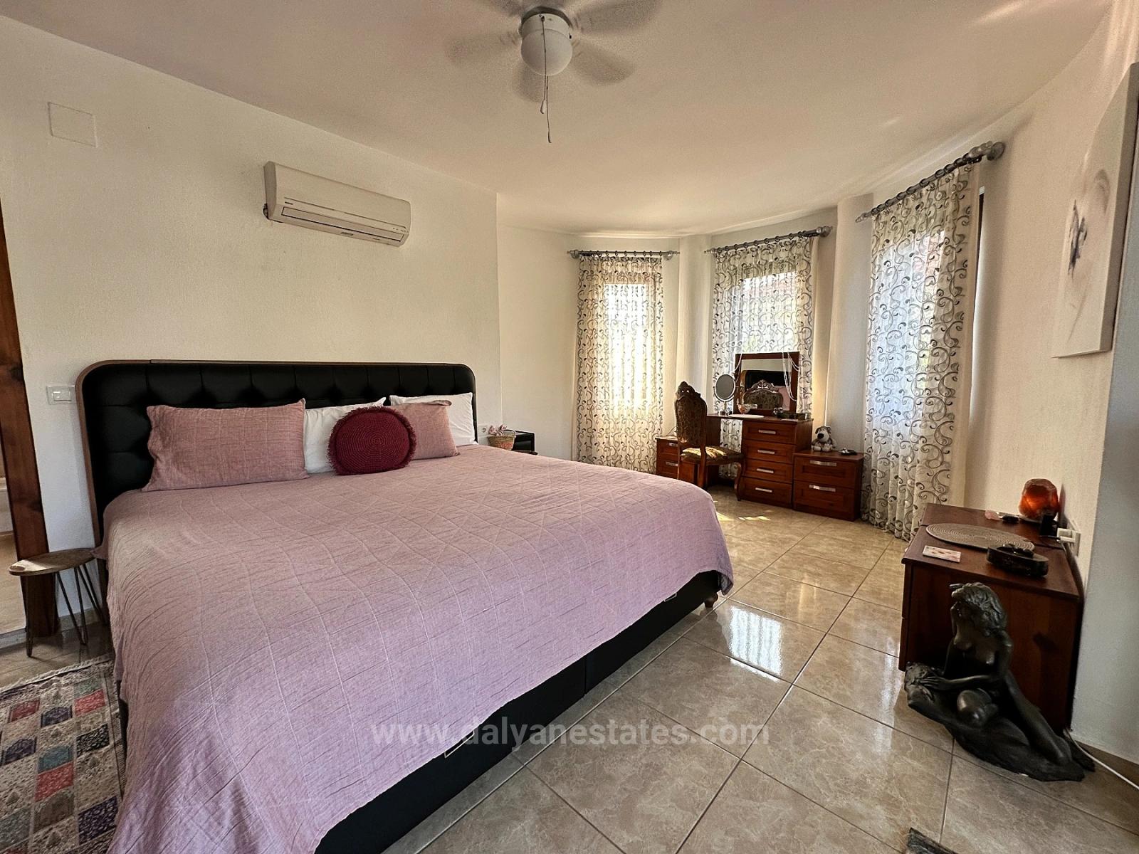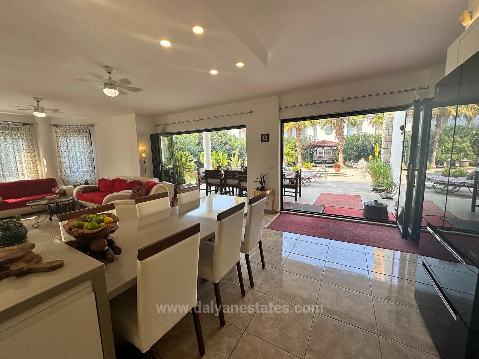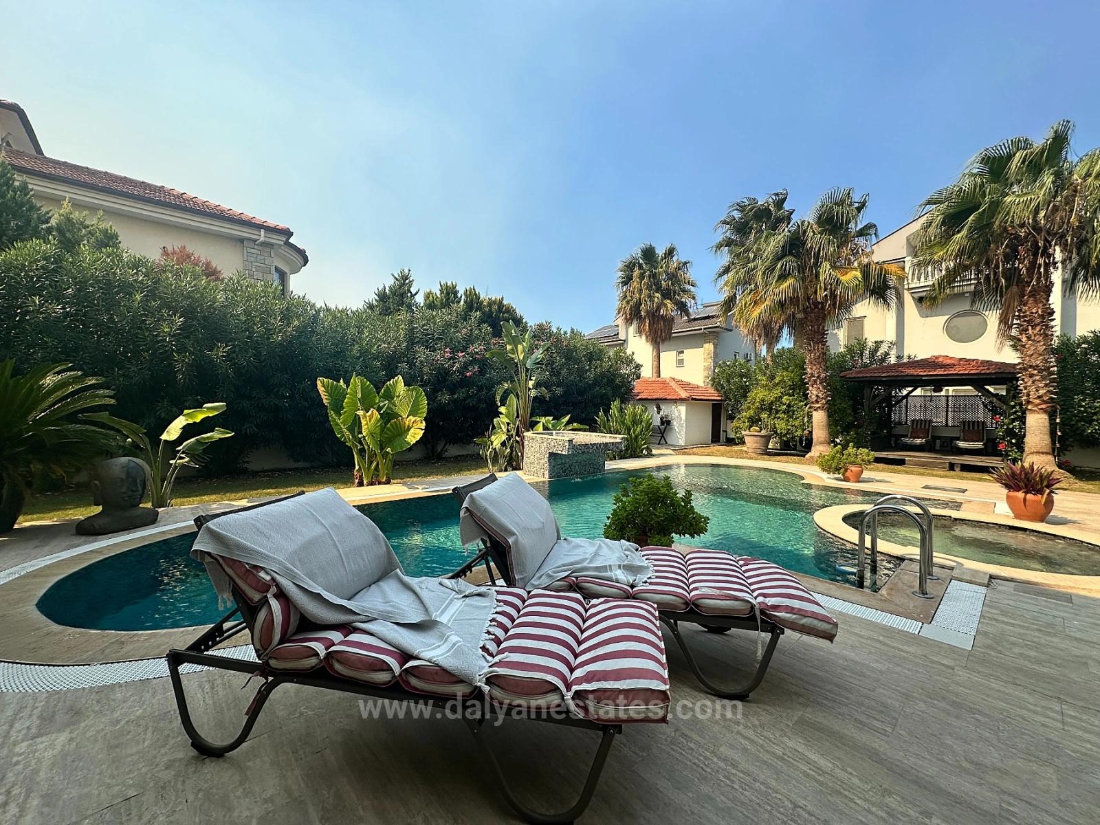 Versteckt im Herzen des angesehenen Viertels Maraş in Dalyan liegt eine Villa, die eher einem Traum als der Realität entsprungen zu sein scheint – ein Wohnraum, in dem architektonische Eleganz und natürliche Schönheit in perfekter Harmonie verschmelzen. Diese atemberaubende Residenz ist mehr als nur ein Haus; Ein Refugium für all jene, die jeden Augenblick des Lebens mit Eleganz genießen möchten. Schon beim Betreten der Villa erscheint sie wie eine Welt für sich. Der von hohen Mauern umgebene Garten erhebt sich wie ein schützender Kokon und birgt ein Paradies voller farbenprächtiger Blumen, sorgfältig geschnittener Sträucher und Bäume voller reifer Früchte. Neu angelegte Natursteinwege schlängeln sich durch duftende Blumenbeete und führen zum Herzen der Villa: einem prächtigen, beheizten Salzwasserpool mit Whirlpool. Schwimmen wird hier zur Kunstform – ein sanft plätschernder Wasserfall erfüllt die Luft mit dem beruhigenden Rauschen des Wassers, während ein flacher Liegebereich zum Abkühlen und Entspannen einlädt, halb im goldenen Sonnenschein.