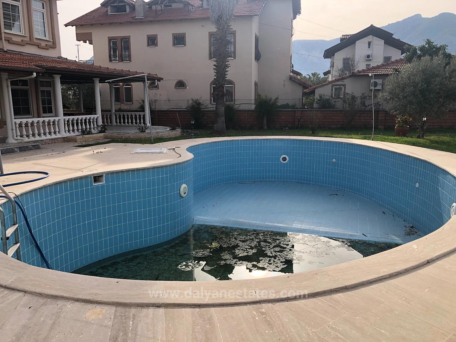 In Osmanağalar, einem der beliebtesten Viertel von Dalyan, in einer Ruhigen Seitenstraße und nur vom Zentrum entfernt Nur acht Gehminuten von der Hausnummer 326 entfernt, ist die Villa Khalid eine beeindruckende Residenz, die die Eleganz vergangener Zeiten in die Gegenwart trägt. Auf einem großzügigen Grundstück von 900 m² gelegen, spiegelt diese traditionelle türkische Villa mit ihren geräumigen Zimmern, der soliden Architektur und der unverwechselbaren Ausstrahlung den alten, etablierten Baustil von Dalyan wider. Die großzügigen Raumgrößen und die ausgewogene Raumaufteilung, die in Neubauten selten zu finden sind, verleihen dem Haus sowohl Erhabenheit als auch Gemütlichkeit. Der 40 m² große, nierenförmige Swimmingpool liegt mitten im Garten und bietet dank seiner unterschiedlichen Tiefen ideale Bedingungen für Schwimmer und alle, die sich abkühlen möchten. Die große Rasenfläche bietet viel Potenzial für Kinder, Haustiere oder die Verwirklichung von Gartenträumen. Zum Grundstück gehören ein Parkplatz und eine Veranda, die im Laufe der Zeit möglicherweise renoviert werden muss. Im hinteren Teil des Hauses, angrenzend an die Küche und den überdachten Essbereich im Freien, befindet sich ein gemauerter Grillplatz, der sich ideal für lange Sommerabende eignet. An der Vorderseite des Hauses erstreckt sich die geräumige und schattige Veranda, die mit ihren zahlreichen Sitzgelegenheiten zum Verweilen einlädt und gleichzeitig eine angenehme, vor der Sommersonne geschützte Atmosphäre bietet. Beim Betreten des Hauses durch den prächtigen Haupteingang vermitteln die luftige Diele und die geschwungene Holztreppe, die sich direct vor Ihnen erhebt, sofort den besonderen Charakter des Hauses. Das großzügige Wohn- und Esszimmer auf der linken Seite mit seinem Kamin bietet den idealen Rahmen für Feiern und Familienfeste. Das Familienzimmer auf der rechten Seite kann bei Bedarf als viertes Schlafzimmer genutzt werden. Die geräumige Küche bietet großes Potenzial und wartet darauf, mit modernen Akzenten neu gestaltet zu werden. Im Erdgeschoss befindet sich außerdem ein Badezimmer.