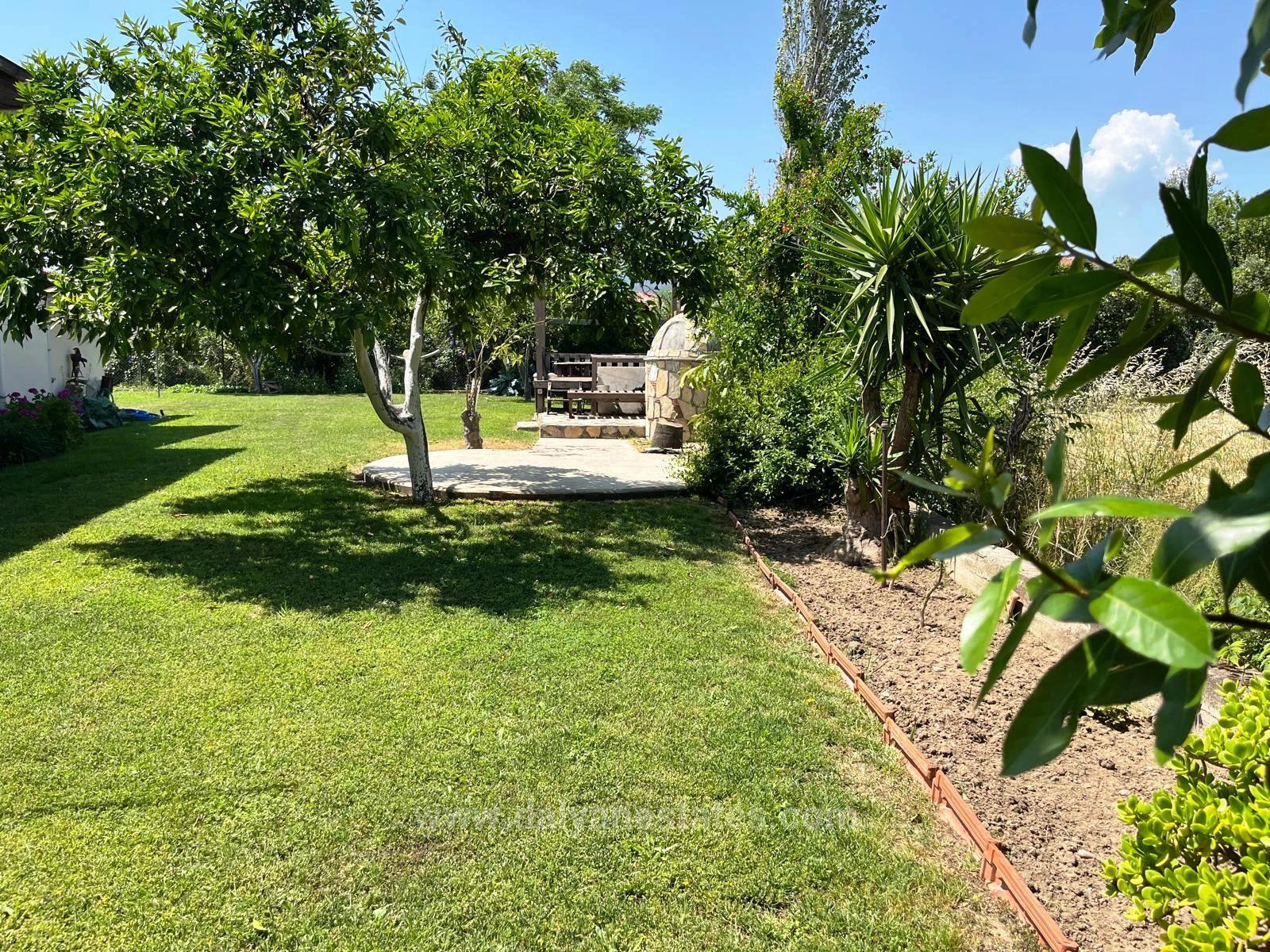 Before stepping inside, you are greeted by spacious, well-maintained lawns, colorful flowers, and carefully cultivated shrubs, offering a truly sensory welcome. The garden, with its handcrafted pizza oven and barbecue area, is designed for long gatherings, friendly get-togethers, and summer evenings. Offering ample space for a large outdoor dining table, the garden also features a spacious platform prepared to accommodate a temporary swimming pool. There is off-road parking for vehicles and a large, solid brick storage area for storage needs. The spacious L-shaped terrace surrounding the house, covered with flowers, offers a cool and shady living space on Dalyan's hot summer days. The ceiling fan creates a refreshing atmosphere even when the mountain breeze subsides. This terrace becomes an extension of the house, a space that is lived in at all hours of the day. Upon entering through the main door, you are greeted by a traditional Turkish-style solid wood kitchen. Offering ample storage space with its upper and lower cabinets, this kitchen inspires you to prepare the most special meals with its carefully thought-out equipment. The hallway leading from the kitchen leads to the heart of the house; Here, a comfortable living room and a separate dining area are furnished with comfortable "easyboy" style armchairs and bergères in new cream tones. The living room opens directly onto the terrace, seamlessly blending the indoor and outdoor spaces and allowing natural airflow throughout the house. The spacious family bathroom, accessed via the hall, is designed with a shower. The first bedroom on the ground floor offers a spacious double room with built-in wardrobes covering an entire wall. The last room, also accessed from the same floor, is a recently constructed private garden room. Thanks to its double-sided glass doors, this room receives sunlight throughout the day and opens directly onto the garden and a second terrace area. Embracing the sun all day long, this terrace is an ideal corner for sunbathing and enjoying tranquil moments. The spacious garden room, accessed via the hall, is designed with comfortable sofas and bergères. data-end="3468">Upstairs, ascending the curved wooden staircase, you are greeted by an upper hall overlooking the mountains. This lovingly designed space serves as a single reading or relaxation nook, offering a unique vantage point for admiring the surrounding mountains. Further up, there is a multi-purpose room that can be used as both a bedroom and a relaxation area, ideal for children or unexpected guests. A second family bathroom on the same floor is notable for its spaciousness and skylight offering views of the night sky.