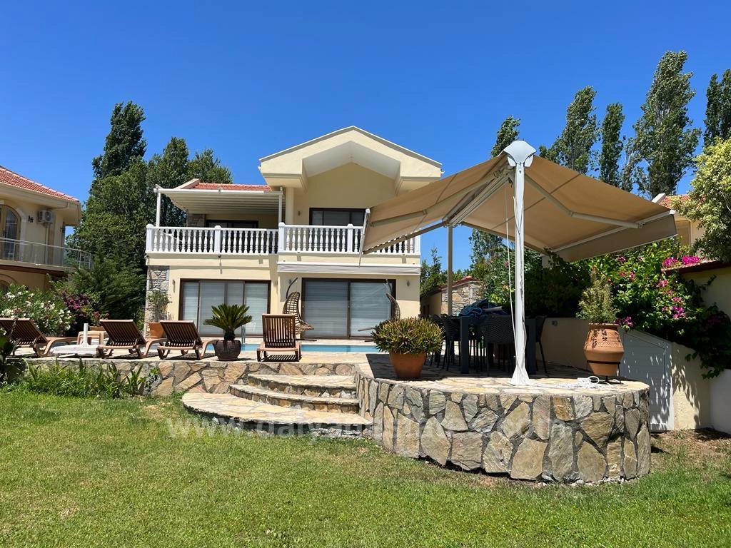 Thus, the view is brought to the heart of the house in its most impressive form. The open-plan living room invites the full splendor of the mountains uninterruptedly inside thanks to the large sliding glass doors that span the entire rear facade of the villa. The extremely spacious and extended balcony, reached by stepping out from these glass doors, is one of the most impressive areas of the house. This villa speaks to its view; and the balcony is designed for you to fully enjoy this view. With comfortable armchairs seating ten people and a large dining table, this is the indispensable place for both sunny days and long evening conversations. An electronic, foldable retractable roof system has been considered for the balcony, which is a real sun trap; thus, comfort is guaranteed in every season. The spacious kitchen, located right next to the living room, has recently been completely renovated and offers an extremely stylish and timeless design with its elegant white cabinets, black porcelain countertops and matching back panels. With its soft lines and classic appearance, it is both aesthetic and functional. The kitchen, with ample cabinet space, is fully equipped with all white goods. The separate dining area inside, with its wooden table seating six, creates an ideal setting for family meals and entertaining guests. The living room also includes a convenient bathroom for guests. Designed with a traditional planning approach, the bedrooms are located on the ground floor to maintain coolness during the summer months. All four bedrooms have spacious en-suite bathrooms designed in a modern wet-floor concept, fully tiled. The elegant marble coverings in cool tones used in each bathroom create an aesthetic unity that extends throughout the villa. The same marble has been re-laid on all floors of the house, giving the spaces a sophisticated and luxurious feel. The villa's exterior is just as impressive as its interior. The spacious garden is covered with well-maintained, lush green lawns; the traditional wooden gazebo at the far end of the garden is a hidden sanctuary for relaxing and enjoying the view. Closer to the house is a 45 m² swimming pool with a separate jacuzzi and a large sun terrace surrounding it. The outdoor dining area, covered with an electrically retractable roof, features a stone barbecue, a sink with under-cabinet, and an outdoor shower, making outdoor living a pleasure year-round. The villa's side features double storage areas and a separate outdoor toilet, while the front has a secure, gated parking area. All outdoor areas are equipped with colourful exterior lighting that highlights the trees, shrubs and walkways, creating a captivating atmosphere in the evening. Villa Cappuccino offers comfortable living year-round thanks to its central heating system and air conditioning units in every room. Recently installed and protected by a CCTV security system, the property has managed to maintain its unique character and warm spirit while preserving a luxurious and contemporary feel thanks to modernization and expansion work. Offered fully furnished, this exclusive villa is an ideal choice as both a year-round family home and a privileged holiday residence with its modern amenities, elegant details and impeccable living spaces. Villa Cappuccino is one of those rare places where view, comfort and elegance come together.