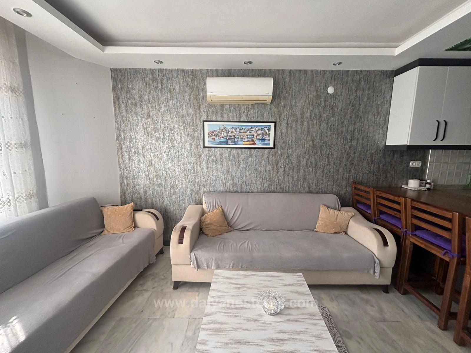 Эта меблированная квартира с бассейном, расположенная на участке в Ортача Дальян, Мугла; Он выделяется как тем, что находится в нескольких минутах ходьбы от центра, так и в тихом месте, вдали от городского шума. Предлагая удобное жилое пространство с просторной гостиной с открытой кухней, 2 комфортабельными спальнями, общей ванной комнатой и туалетом, в квартире также есть балкон, где можно приятно провести время. Наличие солнечной энергетической системы в квартире, которая сдается в аренду полностью меблированной, также дает существенное преимущество. Хотя его расположение очень близко к рынкам и рыночной площади облегчает повседневную жизнь, он предлагает комфортные и приятные возможности для жизни благодаря бассейну и спокойной обстановке на территории.