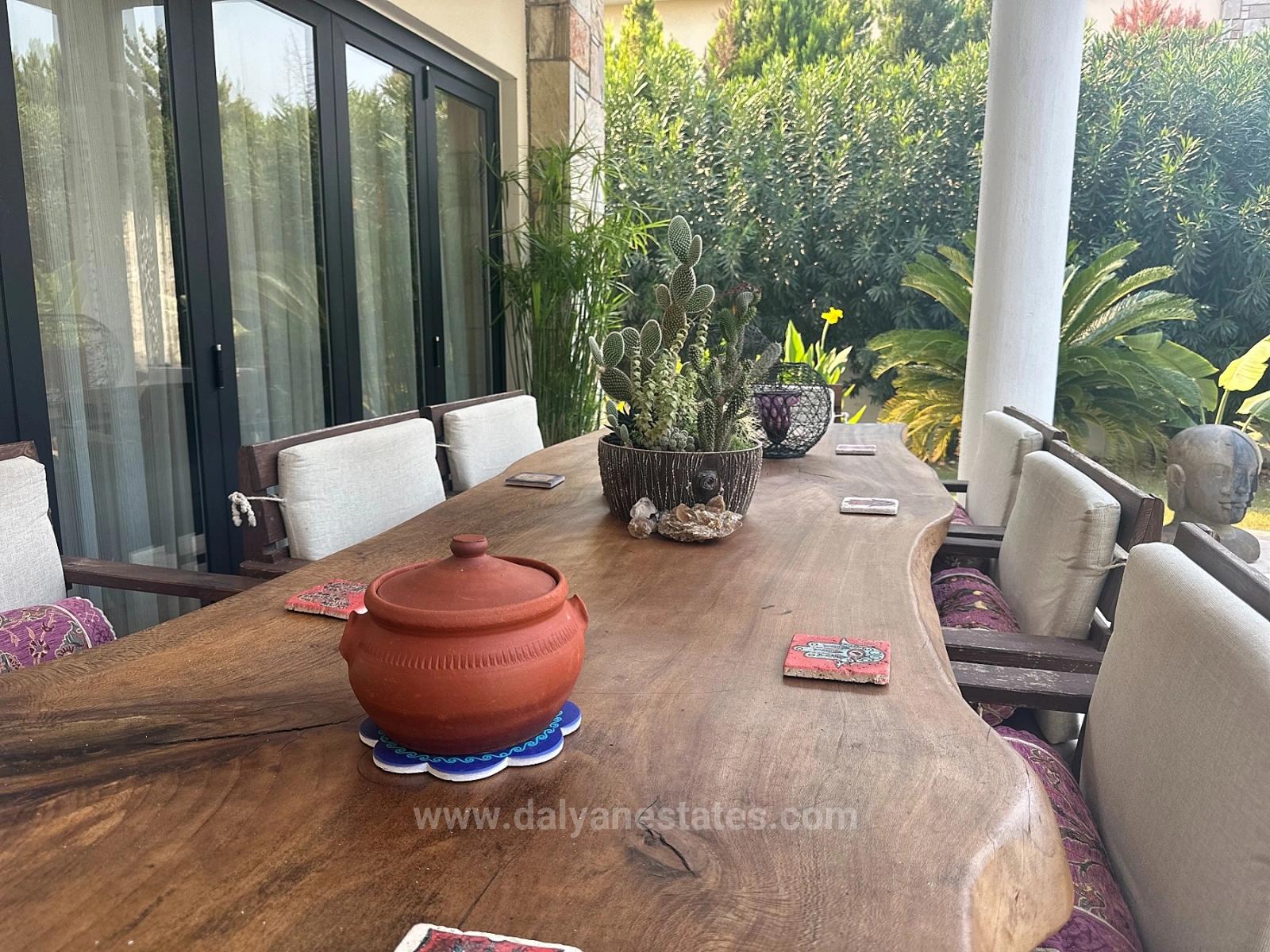 Жизнь на открытом воздухе здесь практически идеальна. Большая тенистая терраса на первом этаже выходит в сад; массивный деревянный обеденный стол в центре — привлекательное место для больших встреч и праздников долгими летними вечерами. Чуть дальше, среди зелени, возвышается традиционный турецкий павильон; его мягкие сиденья создают прохладный, тихий уголок для чтения, мечтаний или отдыха в жаркие дни.