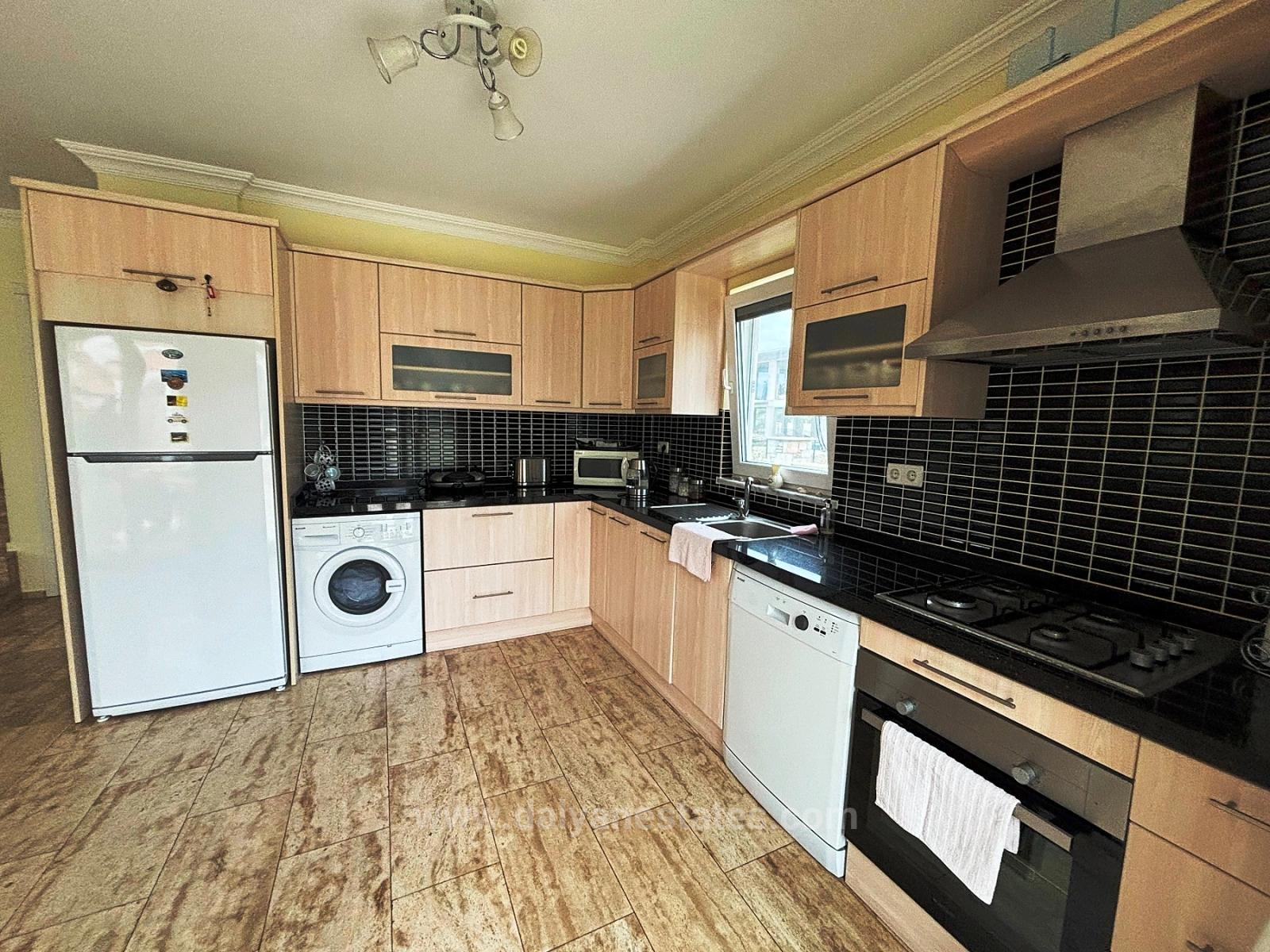 Modern ve tam donanımlı mutfak, geniş dolap alanları, tüm beyaz eşyaları ve rahat çalışma alanlarıyla hem aile yemekleri hem de misafir ağırlamak için idealdir.